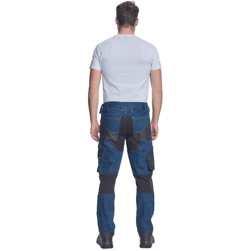 pracovné nohavice z predpraného DENIM materiálu, slim strih, znížený pružný pás, odolné trojité prešitie nohavic a sedu, 2 predné klínové vrecká, 2 zadné vrecká na suchý zips, ľavé stehenné multifunkčné vrecko, pravé stehenné vrecko na meter a nôž, "D" krúžok, pútko na náradie v páse, CORDURA zosilnenie v oblasti kolien, originálne spracovanie zapínania nohavíc, reflexné prvky vo farebnom odstieni, nastaviteľná dĺžka nohavíc, možnosť predĺženia až o 5 cm. Materiál: 97% bavlna, 3% elastan, 370 g/m2.