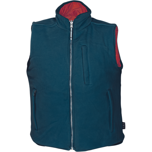 Obojstranná zateplená dámska vesta so stojačikom a predĺženým chrbtom. Kombinácia polyesterového fleecu s nylonovou tkaninou s nepremokavou úpravou.